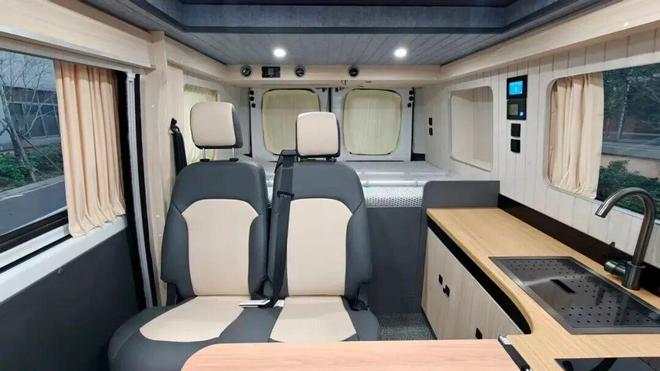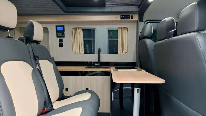 车内以暖黄色木纹饰板与灰色皮革座椅为主调,弱化了越野车的粗犷感,营造出居家般的温馨氛围。六座布局兼顾社交与实用性:前排双座支持电动调节、通风加热及旋转功能,与折叠桌板组合成多功能区;后排双人卡座可调整为对坐模式,并拼合成2500mm×900mm纵床,满足多人休息需求。车内隔音、保温处理与LED氛围灯的搭配,进一步提升了旅居舒适度。