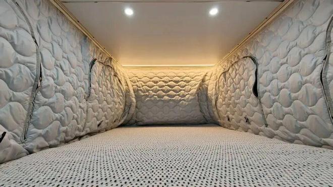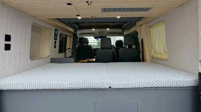 睡卧系统是北斗Y500的核心亮点之一。升顶结构采用硬质顶板与软性篷布混合设计,升起后形成1950mm×1300mm的双人床,配合隐私窗帘与阅读灯,打造出私密的休憩空间。车尾横置床(1300mm×1920mm)与会客区电动吊床(可选装)形成“三床位”布局,满足家庭或团队出行需求。